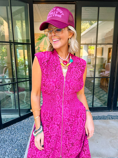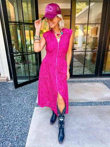 The Rosalinda Lace Smocked Zip Up Dress in Merlot is romance and elegance rolled into one. Her smocked bodice and delicate lace detailing give a fl...