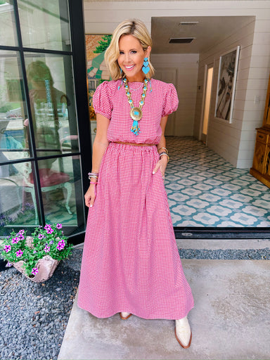 Daphne Gingham Midi Skirt Set is charming, playful, and ready to turn heads. She’s perfect for twirling around Round Top in booties or keeping it b...