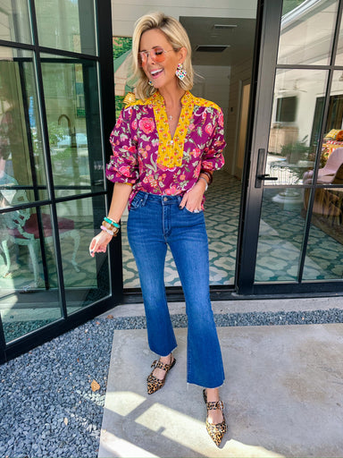 THIS IS A FINAL SALE ITEM A fresh twist on fall florals. The Garden Parade Striped Puff Sleeve Top has subtle stripe detailing and delicate embroi...