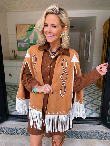 The Cowgirl On Fringe Cape in Camel brings a touch of western charm with her soft suede feel and playful fringe that sways with every step. She’s t...