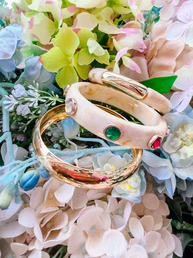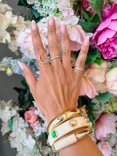 The Thrice As Nice Bangle Set in Ivory proves that good things come in threes. This playful stack features a mix of gold and ivory bangles, with su...