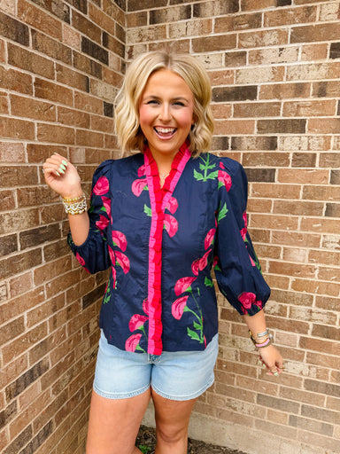 The Charlotte Ruffle Trim Floral Top is flirty, feminine, and full of charm. With delicate ruffle trim, a button-up front, and elastic cuffs, she’s...