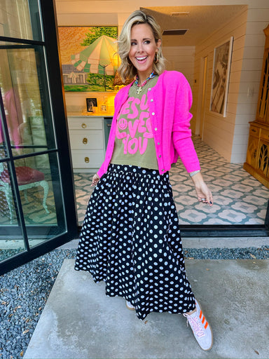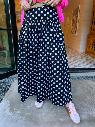 The Piper Polka Dot Midi Skirt in Black brings timeless fun to your wardrobe. With a flattering midi length and classic polka dot pattern, she twir...