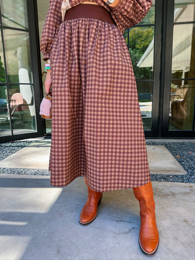 The Georgie Gingham Midi Skirt in Brown brings classic charm with a playful edge. Her flattering silhouette and timeless gingham pattern make her p...