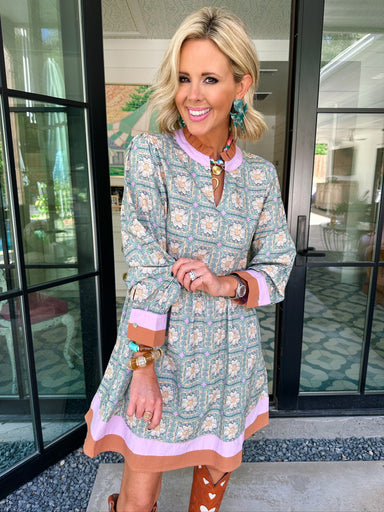 The Crochet Crush Mosaic Floral Dress in Mint and Lavender brings cozy charm into autumn with her crochet inspired print and mosaic floral design. ...