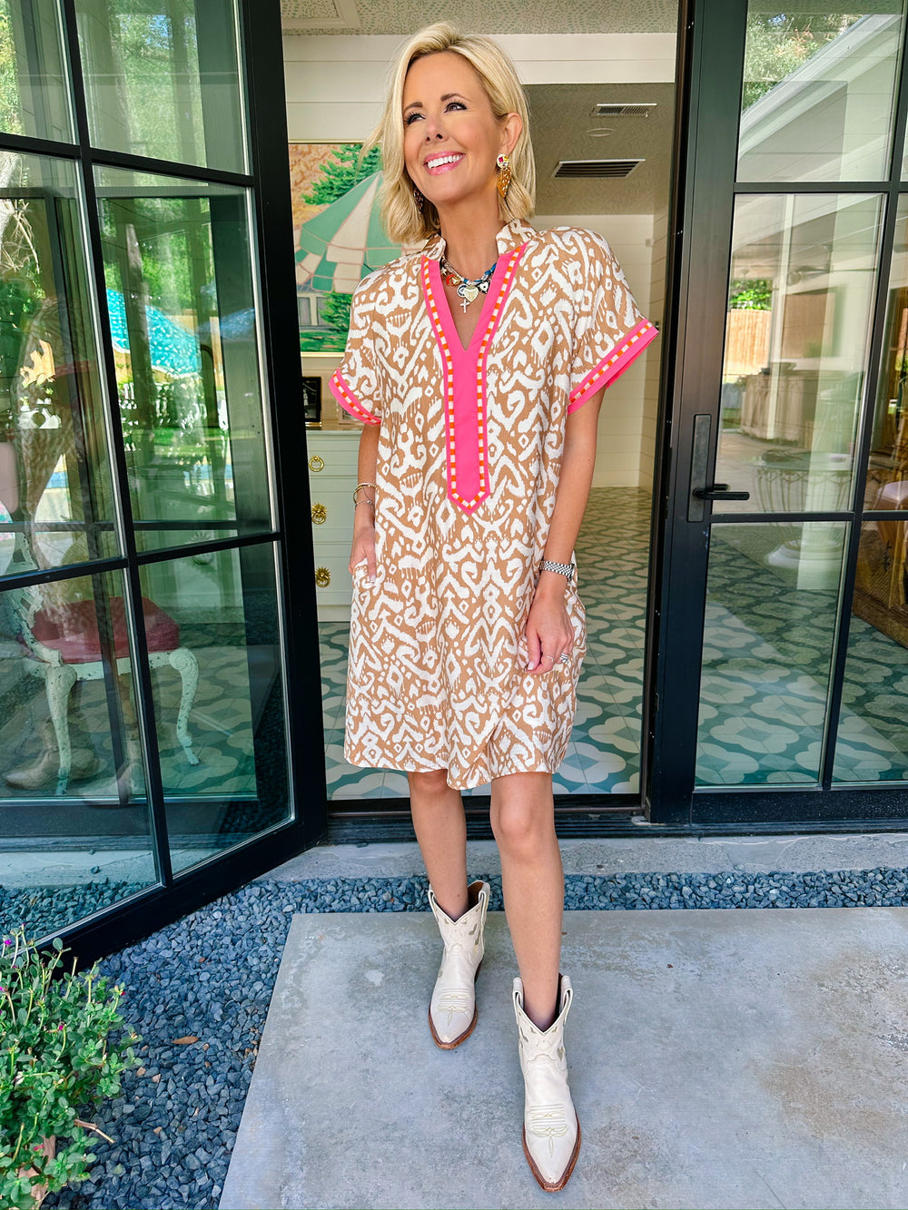 She’s effortlessly easy with just the right touch of sweet. The Sandswept V-Neck Dress in soft beige is your go-to for relaxed days that still call for a little something special. Her subtle pink piping along the sleeves and collar adds a gentle pop of color, while her breezy silhouette makes her perfect for pairing with your favorite sandals or sneakers. Whether you’re grabbing coffee or out shopping with your girls, she’s the kind of dress that makes simple feel beautiful.