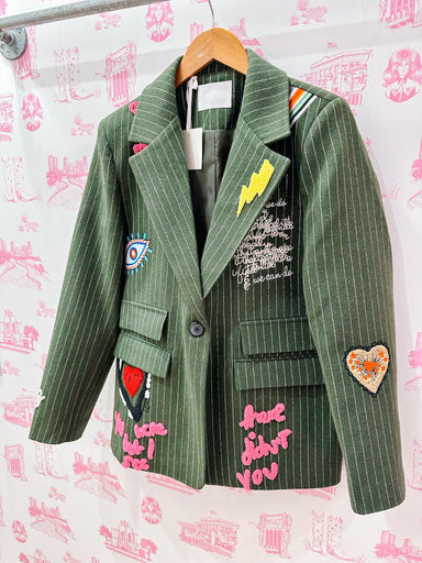 Tailored, but never boring. The Alayna Girl Gang Blazer in Green takes classic pinstripes and gives them a fierce, fresh energy with statement patc...