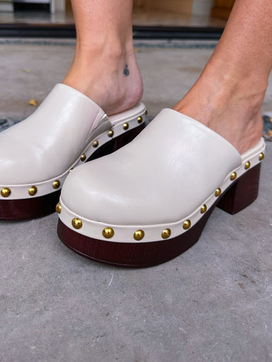 Lily channels 70s vibes with a bold, studded clog design. Her faux leather upper, wood-style platform, and gold-tone studs make a striking, timeles...