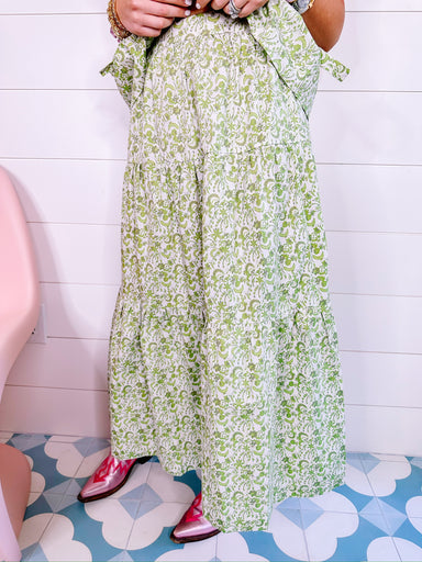 Fresh, flirty, and full of charm, The Charlotte Midi Dress features a playful floral print in green and pink with delicate ruffle trim for a femini...