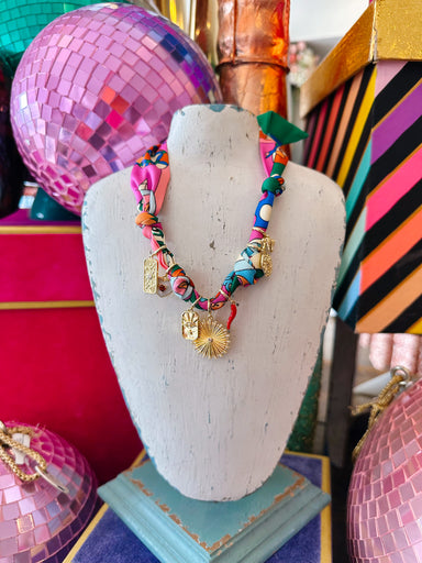 The Liza Multi Charm Scarf Necklace is all about playful details and vibrant style. Her colorful scarf design sets the tone for a fun statement pie...