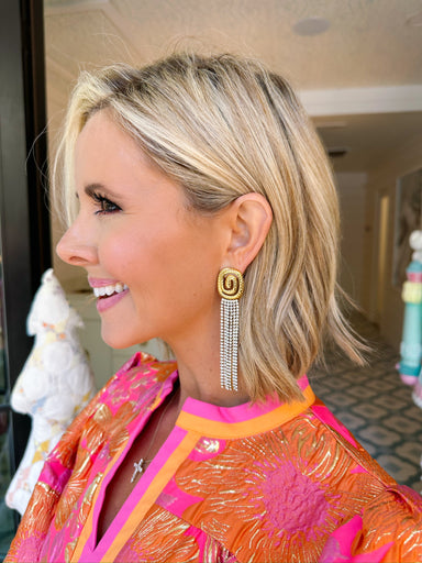 The Athena Swirl Fringe Earring features circle studs with playful CZ dangles and swirling fringe, perfect for holiday parties, New Year’s, or wedd...