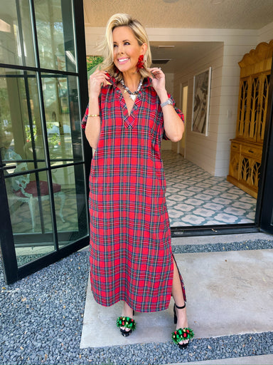 Celebrate the season in the Marjorie Plaid Maxi Dress in green. It features short sleeves, handy pockets, and side slits for a playful, flirty touc...