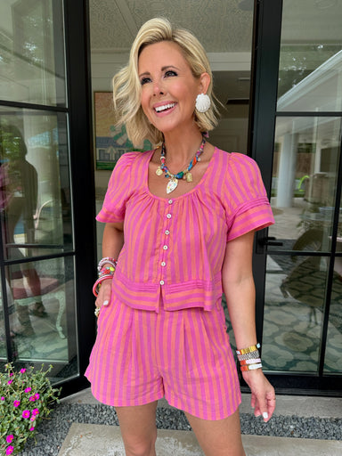 The Mayci Stripe Short Set is playful, fun, and made for twirling through your day. Bold stripes add instant personality while the coordinated top ...