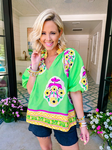 The Mardi Gras Beads Button Up Plaid Top is a full on celebration in shirt form. A gentle plaid base sets the stage for playful, eye catching embel...
