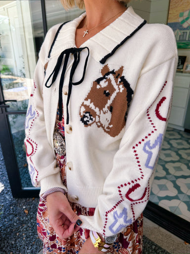 The Lasso Me In Horse Cardigan in cream gallops into style with her classic hue and charming horse motif. She is perfect for fall festivals, cozy e...