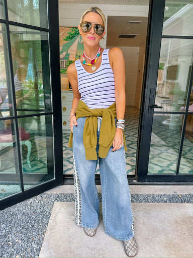 THIS IS A FINAL SALE ITEM The Sprinting Stripes Tank Top in White and Black is bringing major off-duty energy with her sporty stripes and flatteri...