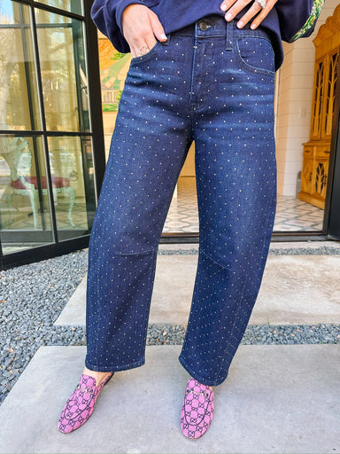 The Stay Entertained Rhinestone Barrel Jean is made to turn heads. Sparkling rhinestone details catch the light for serious showstopper vibes. She’...