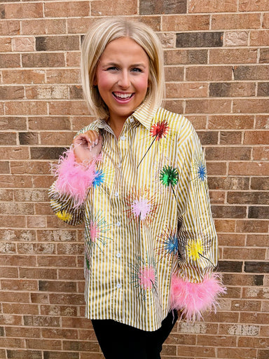 The Sparkler Stripe Button Up Top is all about festive fun and playful sparkle. Feather-trimmed cuffs and sequined designs give her a flirty, party...