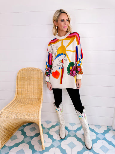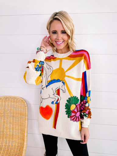 The Lasso Me In Horse Cardigan in cream gallops into style with her classic hue and charming horse motif. She is perfect for fall festivals, cozy e...