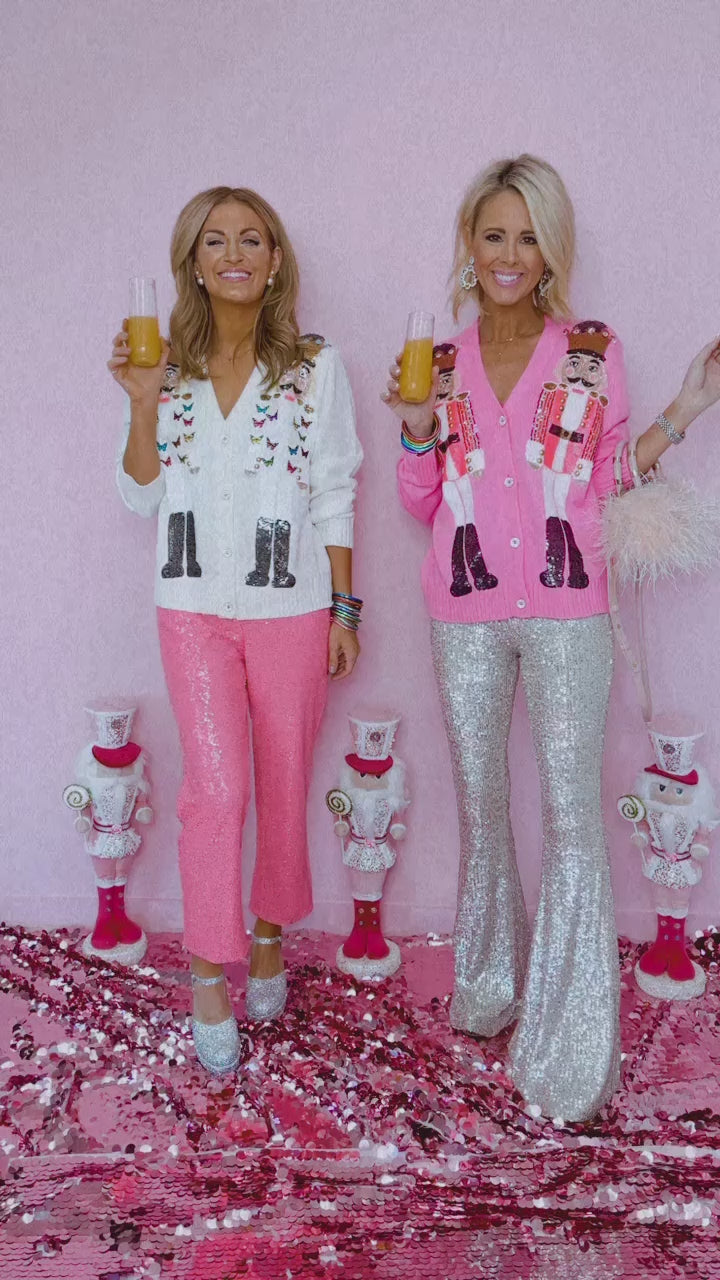 - Features: Relaxed fit, Long sleeve, cardigan, rhinestone button detail, sequin nutcracker