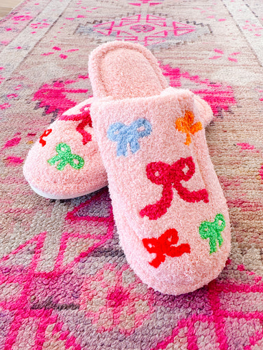 Step into cozy charm with the Bows All Over Slippers in pink. Covered in sweet bow details and ultra-soft plush, they are perfect for lounging, rel...