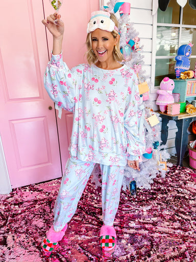Sip, snuggle, and celebrate in the Cocktails With Claus Velour Jogger PJ Set in blue. Made from soft velour with playful bow accents on the sleeves...